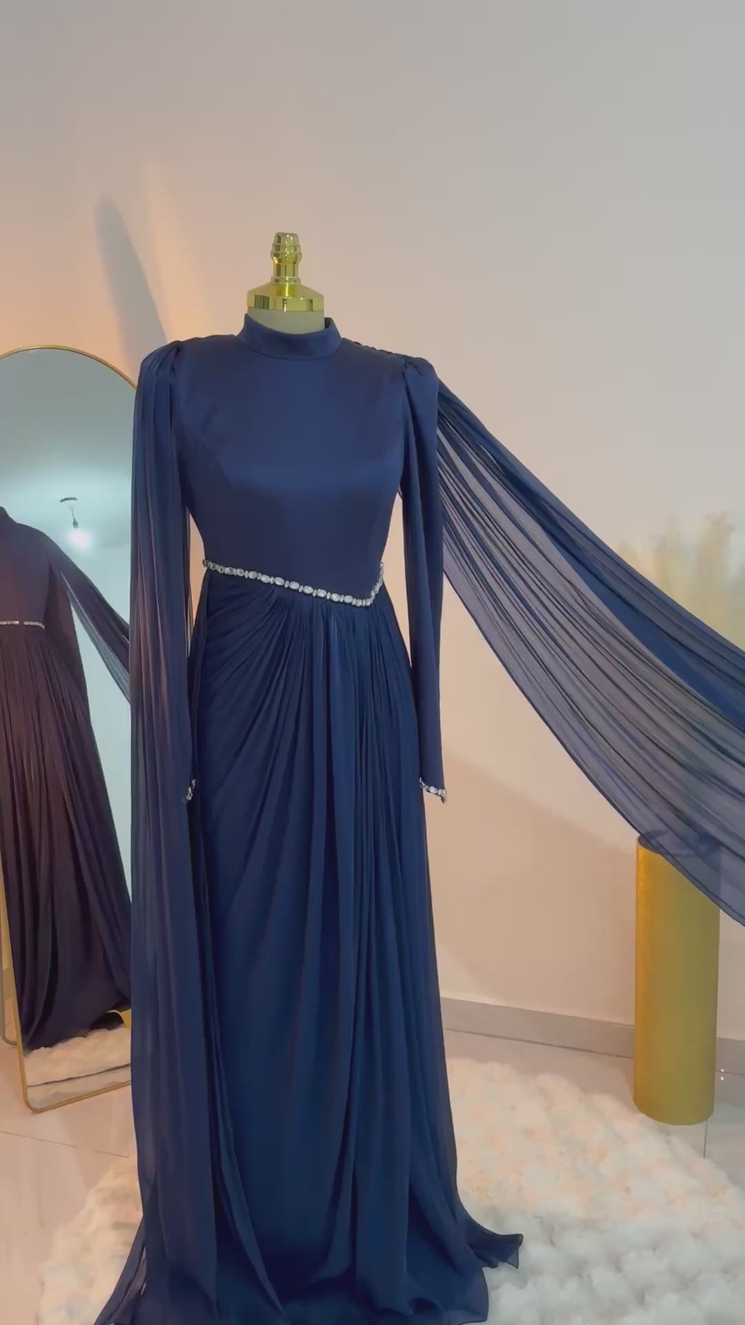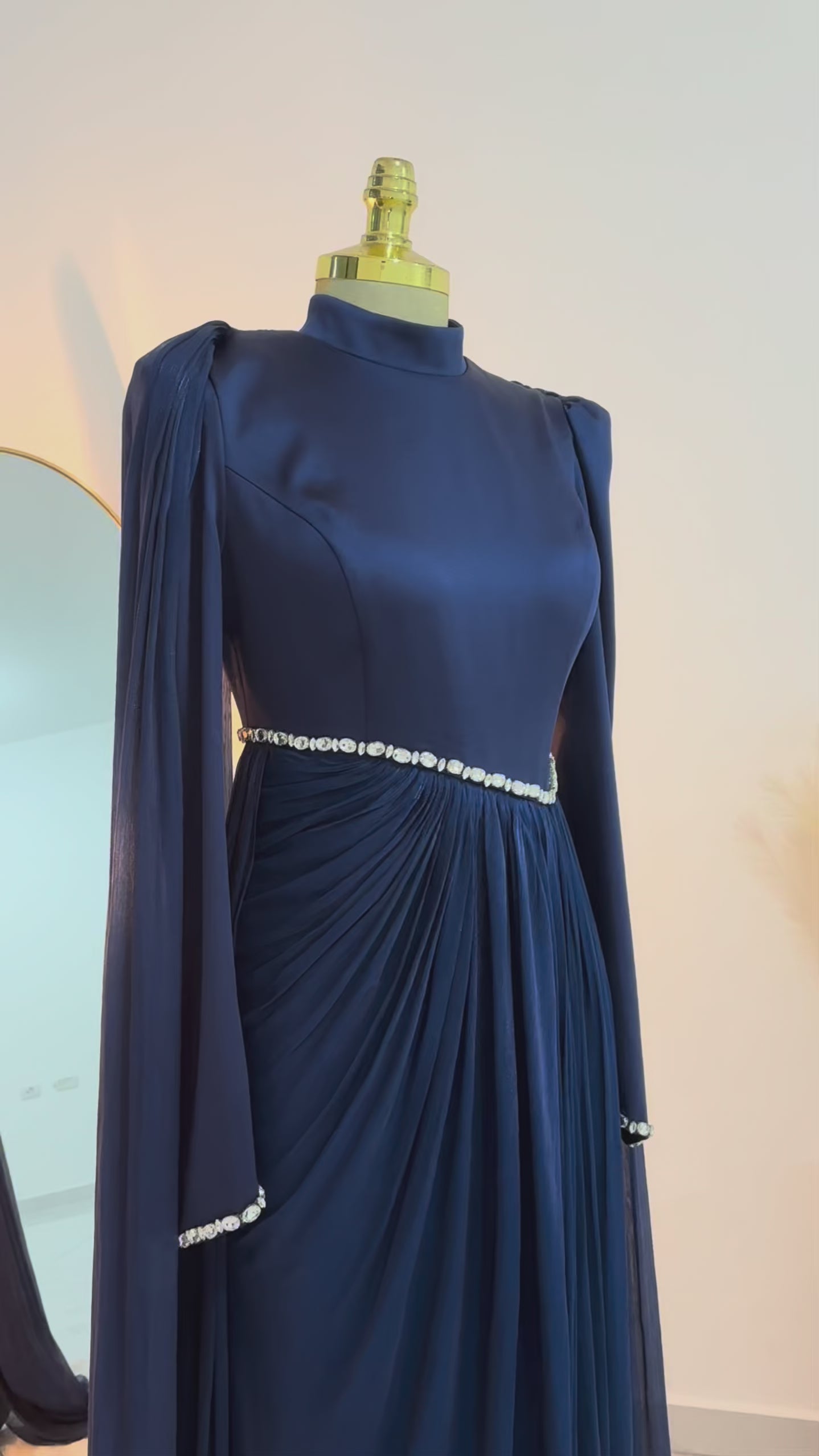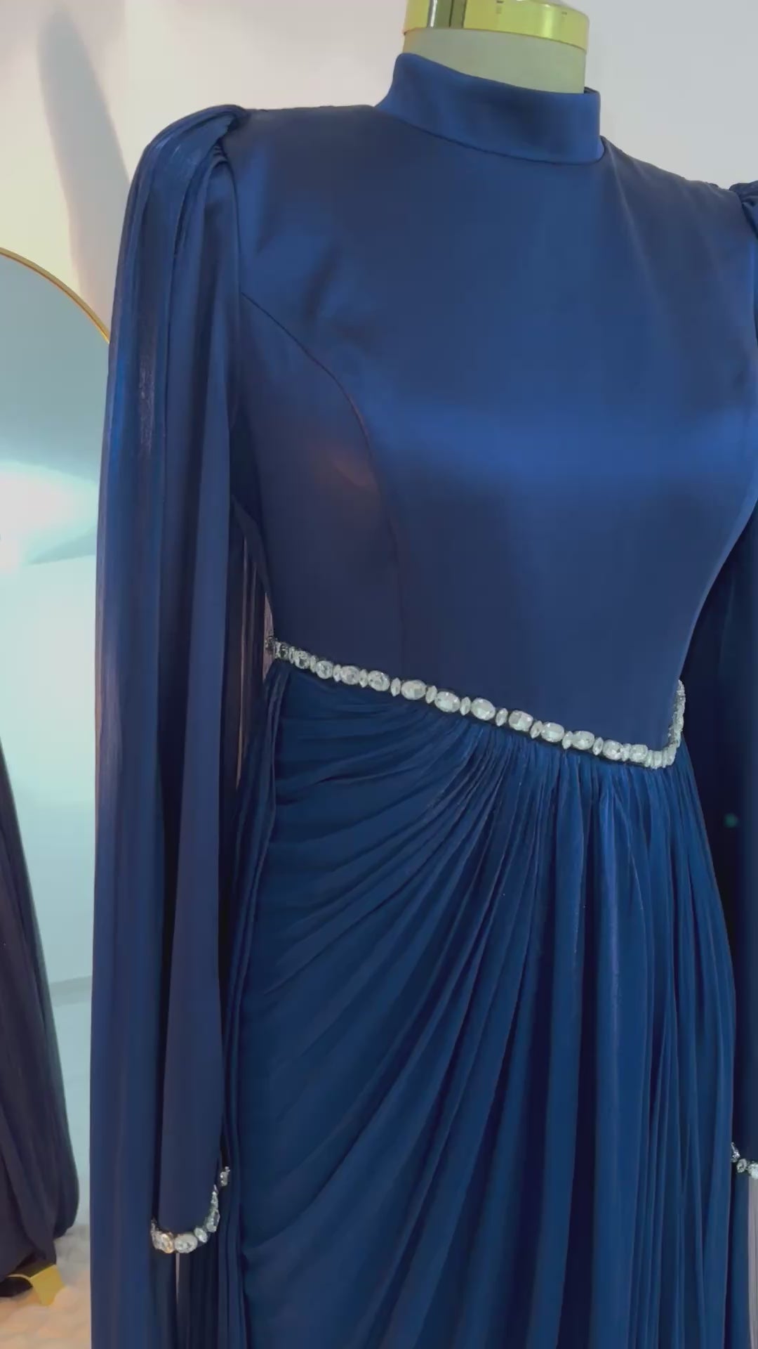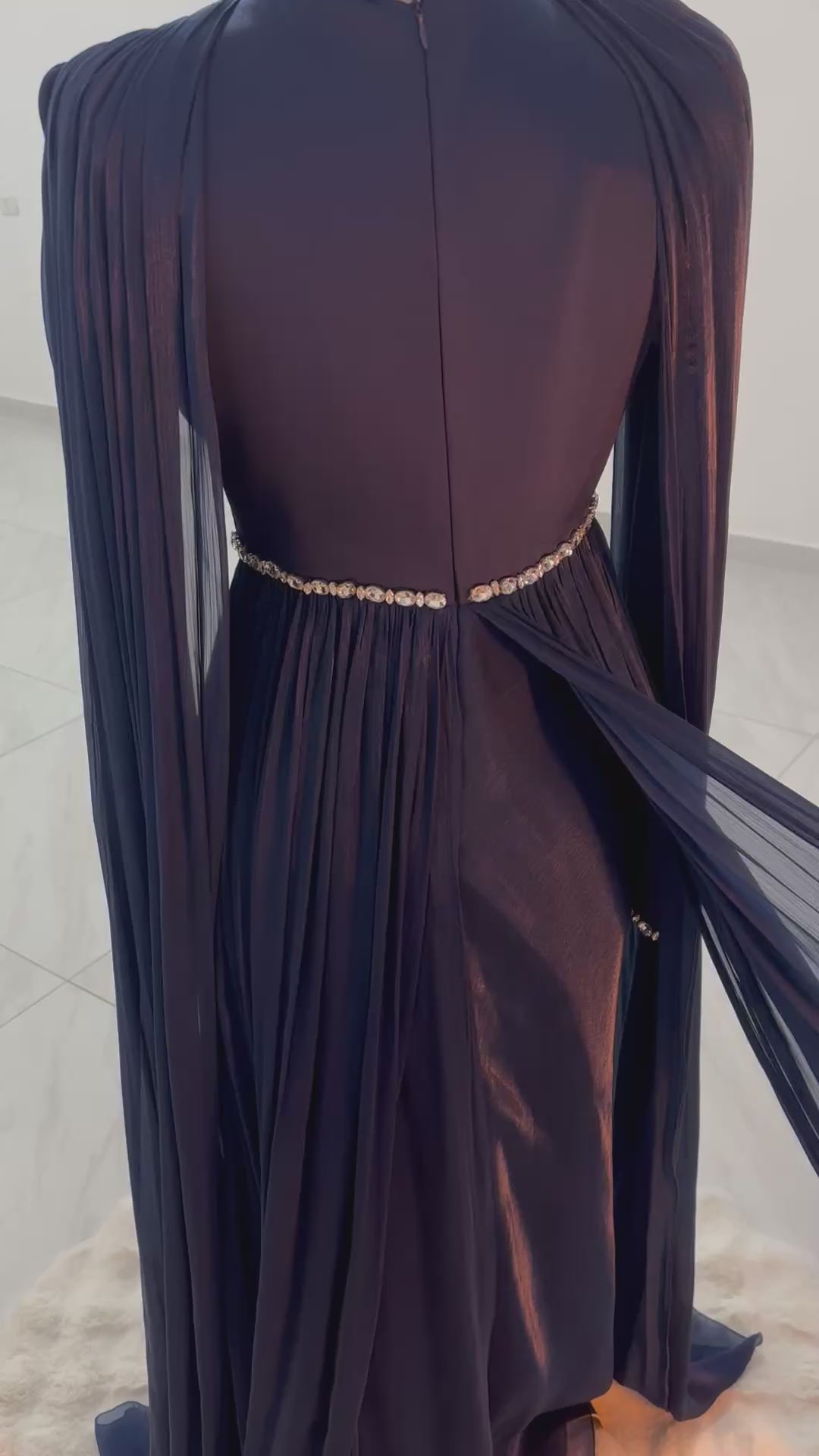✅التفاصيل: خصر مطرز بـ الكريستال على شكل V لإبراز الرشاقة، مع كيب طويل يمنحكِ هيبة الأميرات.
