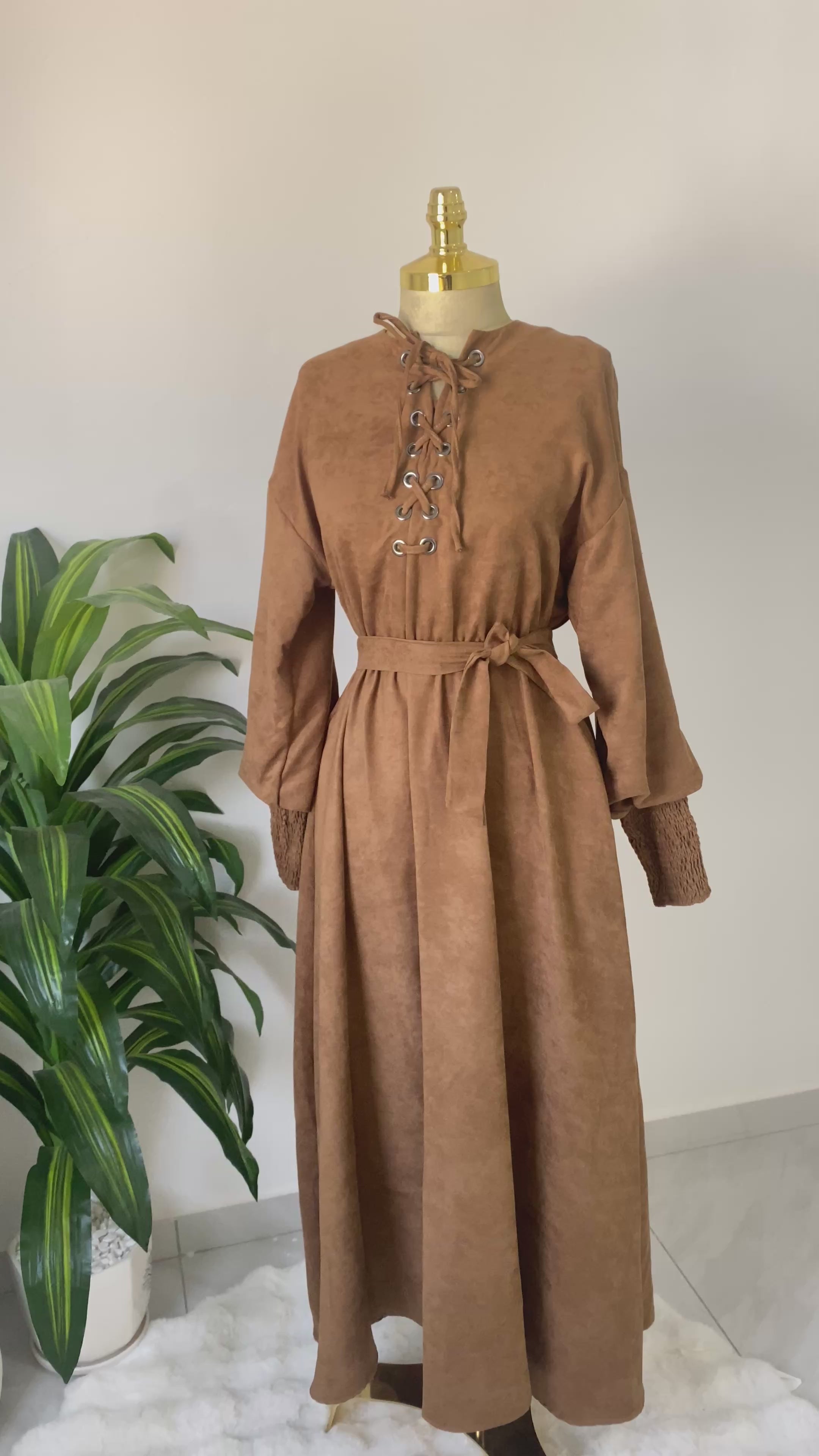 • التفاصيل: يتميز بتصميم "أربطة" (Lace-up) عند الصدر تعطي لمحة شبابية، مع أكمام "زم" عصرية. يأتي معه حزامين من نفس القماش ليرسم الخصر بشكل أنيق