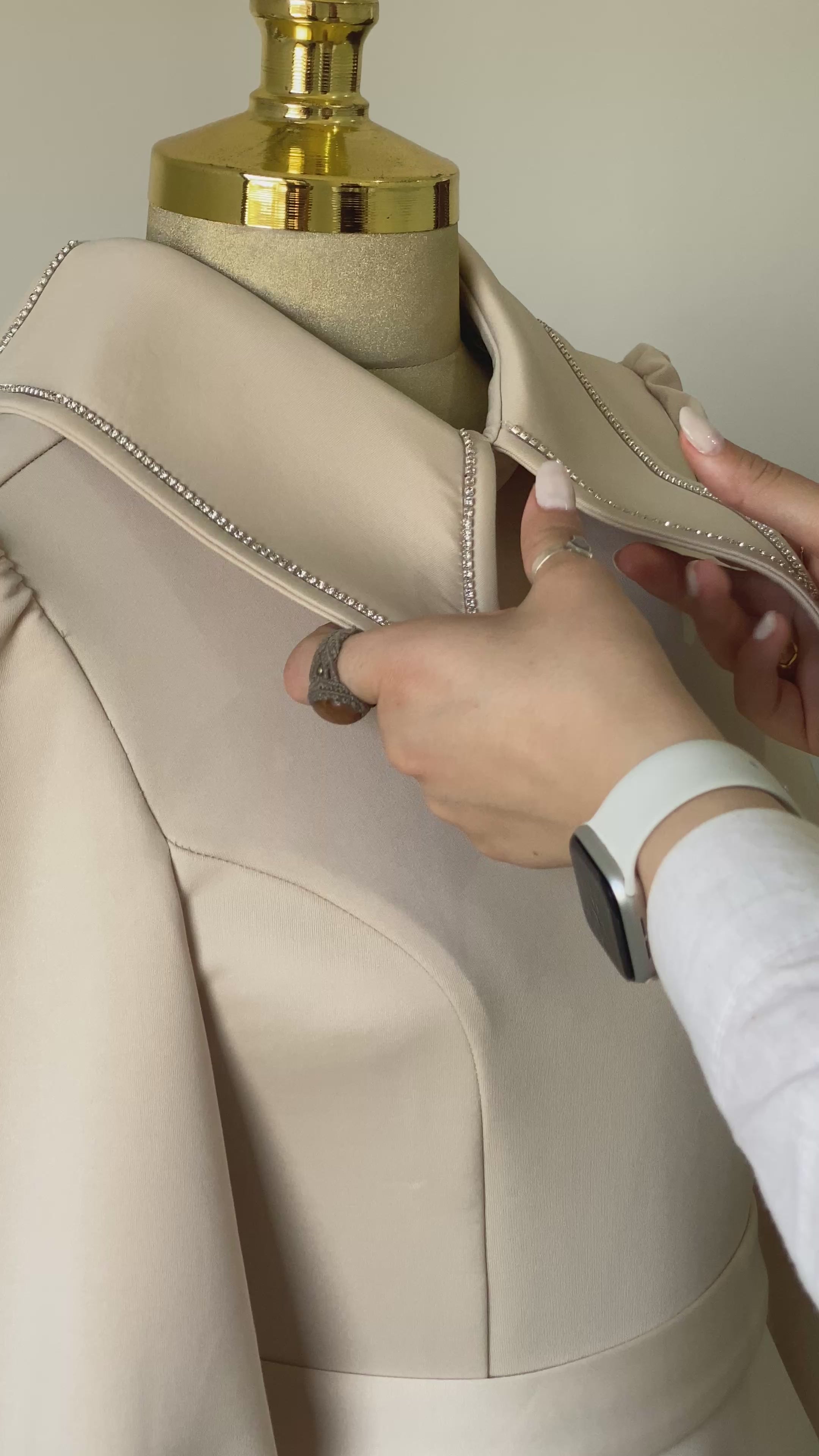✅التفاصيل: يتميز (قبة) عريضة ومطرزة بخرز ناعم، مع حزام من نفس القماش يحدد الخصر بشكل أنيق، وأكمام منفوخة (Puffy) تنتهي بأسورة مريحة.