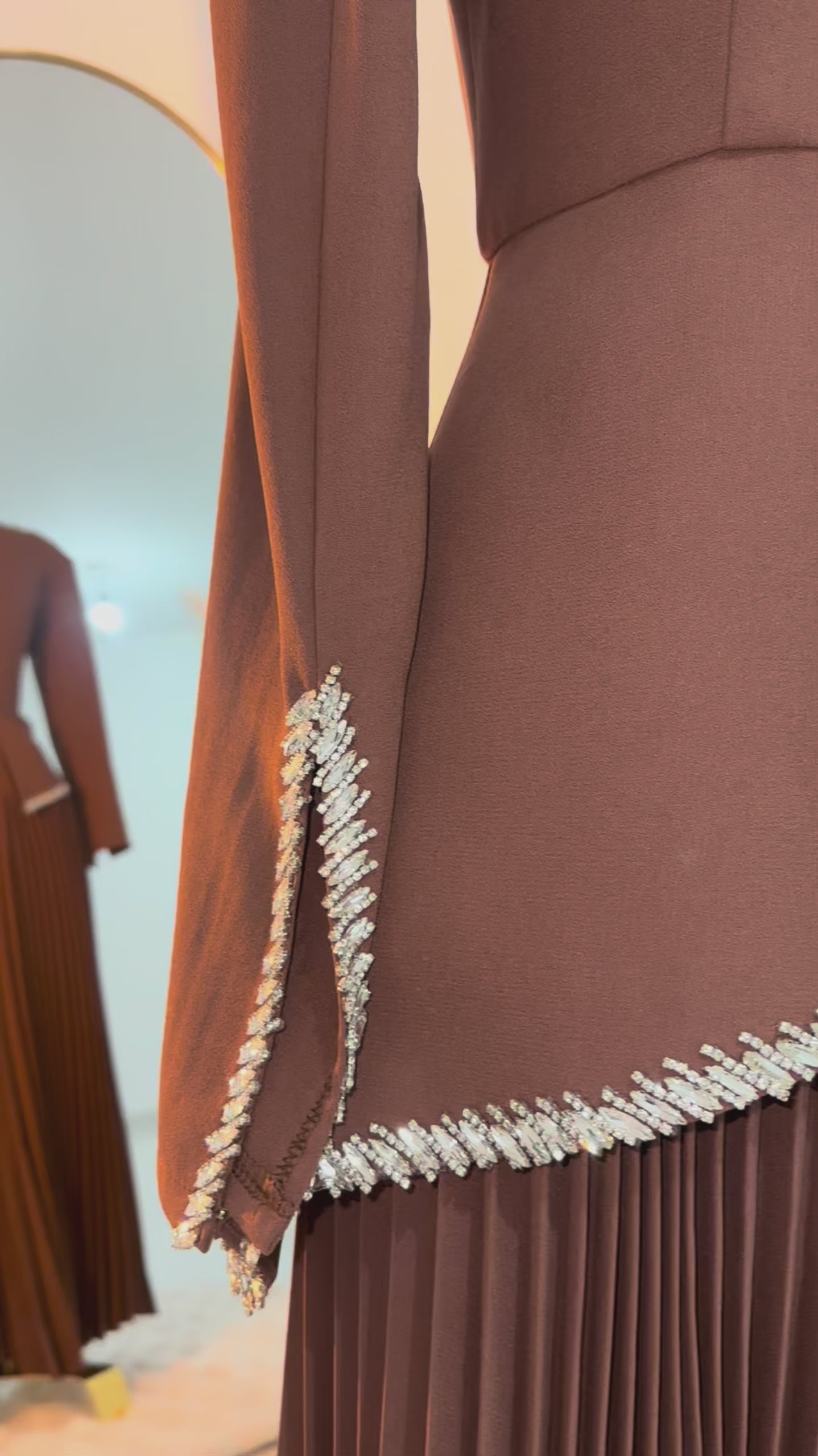 ✅التفاصيل: مزين بشريط كريستال لامع على أطراف الأكمام وبتصميم مائل على الخصر، مما يعطي شكلاً مميزاً وغير تقليدي.